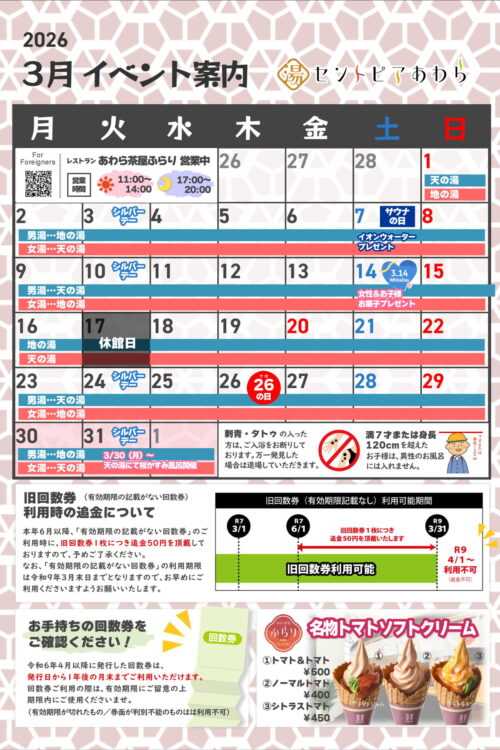 お待たせしました✨11月カレンダーです。 11/23(日)はイベント盛りだくさん! 現物りんご風呂 はっぴーすマンがやってくる!スーパービンゴ大会 2階ステージにて 15:00~ ぜひ皆様お誘...詳細へ -
