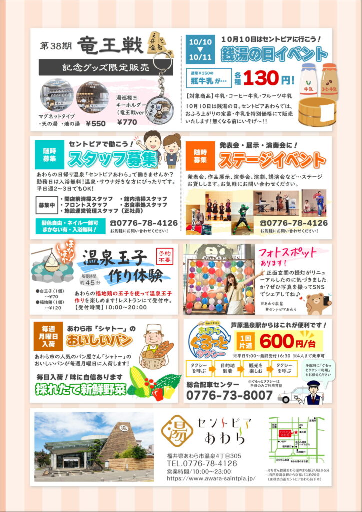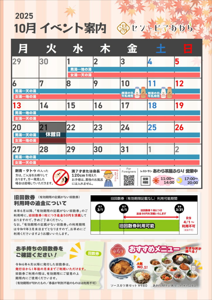 ホーム お知らせ 10月カレンダー お知らせ・イベント 10月カレンダー 2025.09.29 ポスト シェア 10/10(金)は銭湯の日♨ 銭湯の日イベントとして、10/10(金)~10/11(土)の2日間は牛乳を特別価格で販売! 牛乳・コーヒー牛乳・フルーツ牛乳などがお得に飲めちゃう! おふろ上がりに自分の好きな味を見つけてね♪ 関連する投稿 10/10㈭銭湯の日イベント 2024.10.09 10月10日㈭は銭湯の日! 銭湯の日イベント開催いたします! 越のゆグループ毎年... 2025年1月カレンダー 2024.12.27 2025年イベントカレンダー 年末年始も通常通り営業いたします。 新春イベント①... 2/9(日)ジャズコンサート開催! 2025.01.29 心弾むジャズミュージックをお届け 2/9(日)は、福井で活躍するミュージシャン3... はっぴーすマン&村上姉妹とゴミ拾いinあ... 2025.03.20 4/6(日) 8:00~10:00頃 今回はあわら湯のまち駅周辺のゴミ拾いを行い... セントピア夏祭り開催中 2025.07.23 7/5(土)~8/31(日)はセントピアあわら夏祭り! 夏休みはセントピアに遊び...