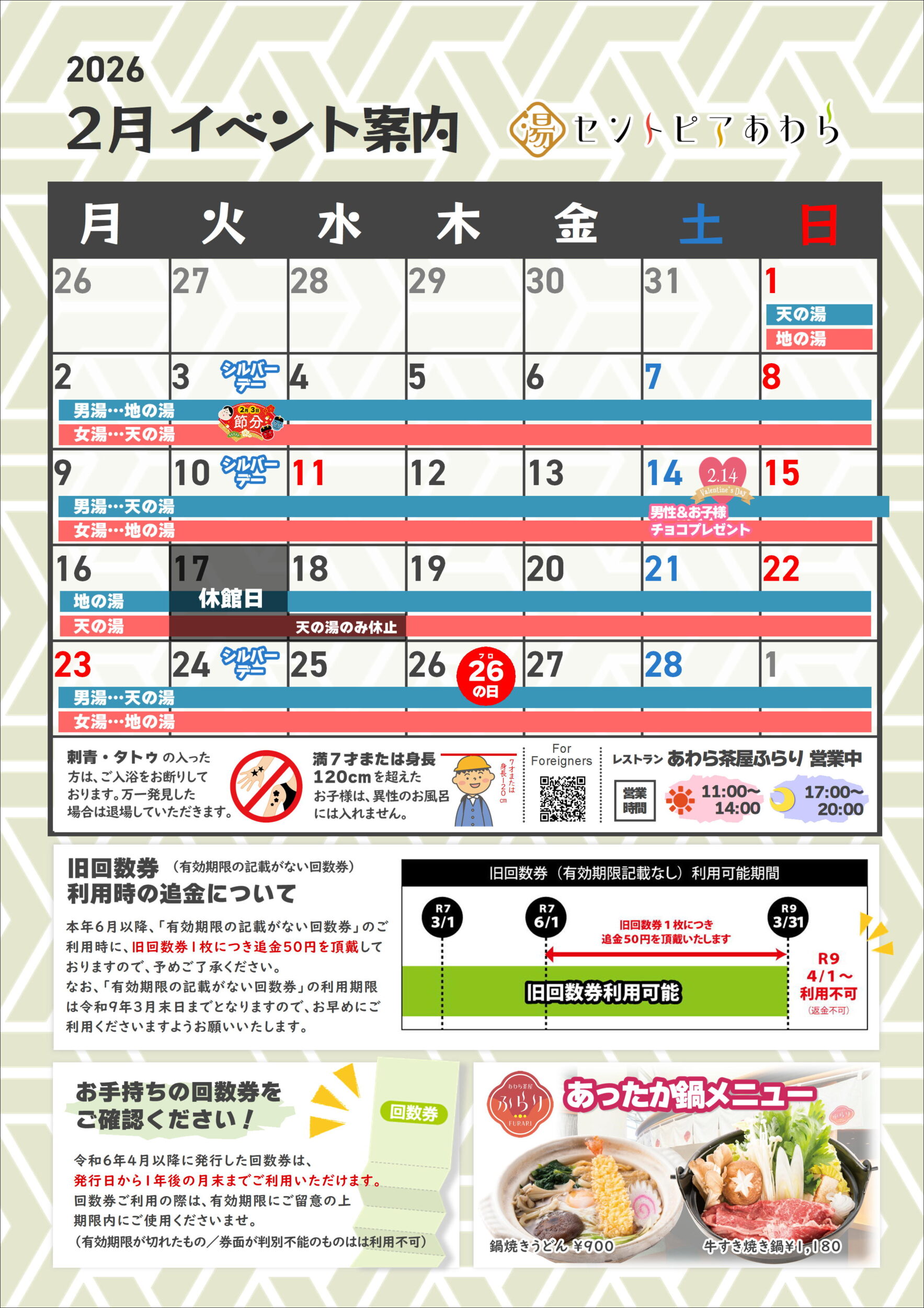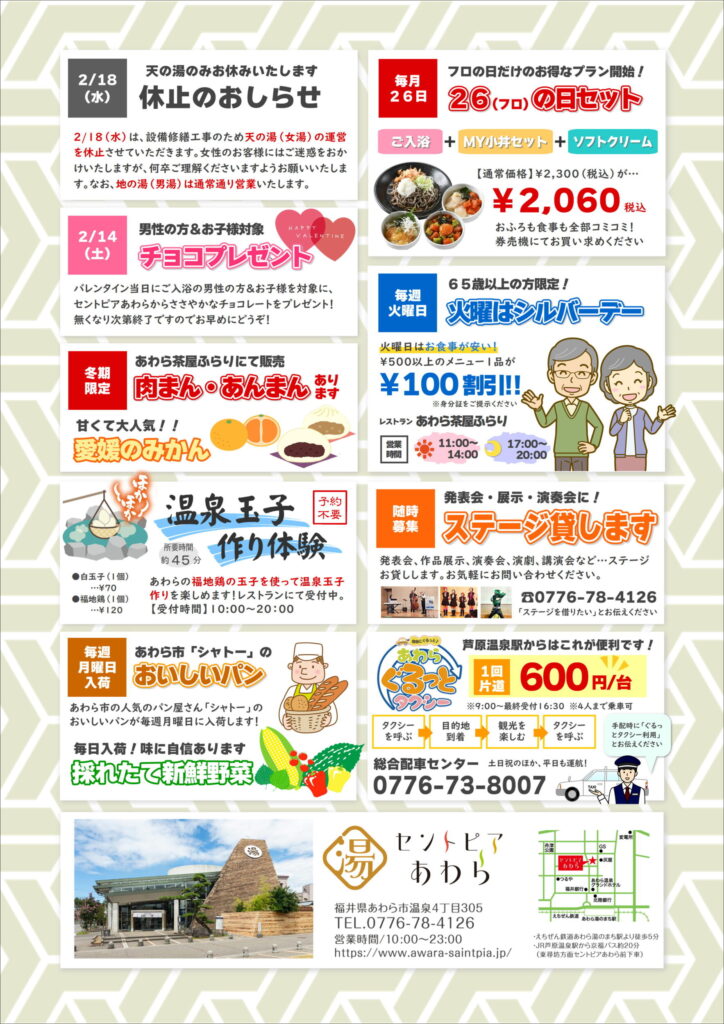 ホーム お知らせ 2月カレンダー お知らせ・イベント 2月カレンダー 2026.02.04 ポスト シェア 【2/18(水)天の湯休止のお知らせ】 2/18(水)は設備修繕工事のため、天の湯(女湯)のみ運営を休止させていただきます。お客様にはご迷惑をおかけいたしますが、予めご了承くださいますようお願い申し上げます。 また、地の湯(男湯)は通常通り運営しております。 関連する投稿 臨時休業のお知らせ 2024.12.12 いつもセントピアあわらをご利用いただき誠にありがとうございます。 2025年1月... セントピア夏祭り開催中 2025.07.23 7/5(土)~8/31(日)はセントピアあわら夏祭り! 夏休みはセントピアに遊び... クールシャンプー設置中! 2024.07.13 夏もすっきり爽やか!クールシャンプー設置 ただいまセントピアあわらでは、夏が終わ... 12/15(日) 銭湯でLet̵... 2024.12.12 「ゆのまちさつまいもフェスティバル2024」 12/14(土)、1... 3/9(日)古代竜士フクイザー ヒーロー... 2025.02.19 セントピアあわらにあのヒーローがやってくる! 白亜紀から眠るフクイラプトルの力を...
